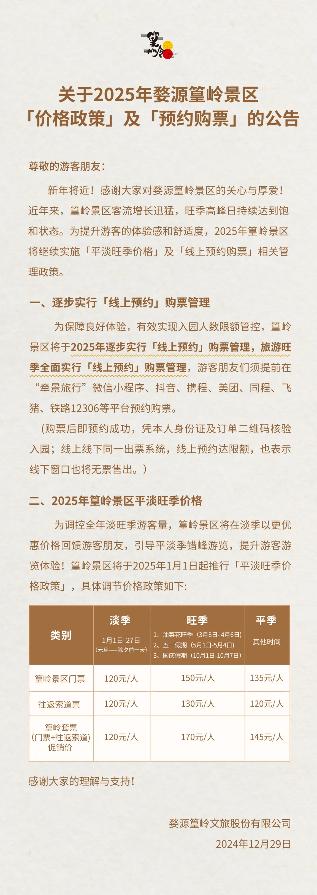 關于2025年婺源篁嶺景區「價格政策」及「預約購票」的公告