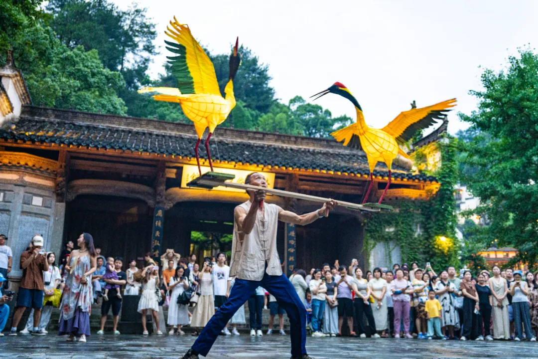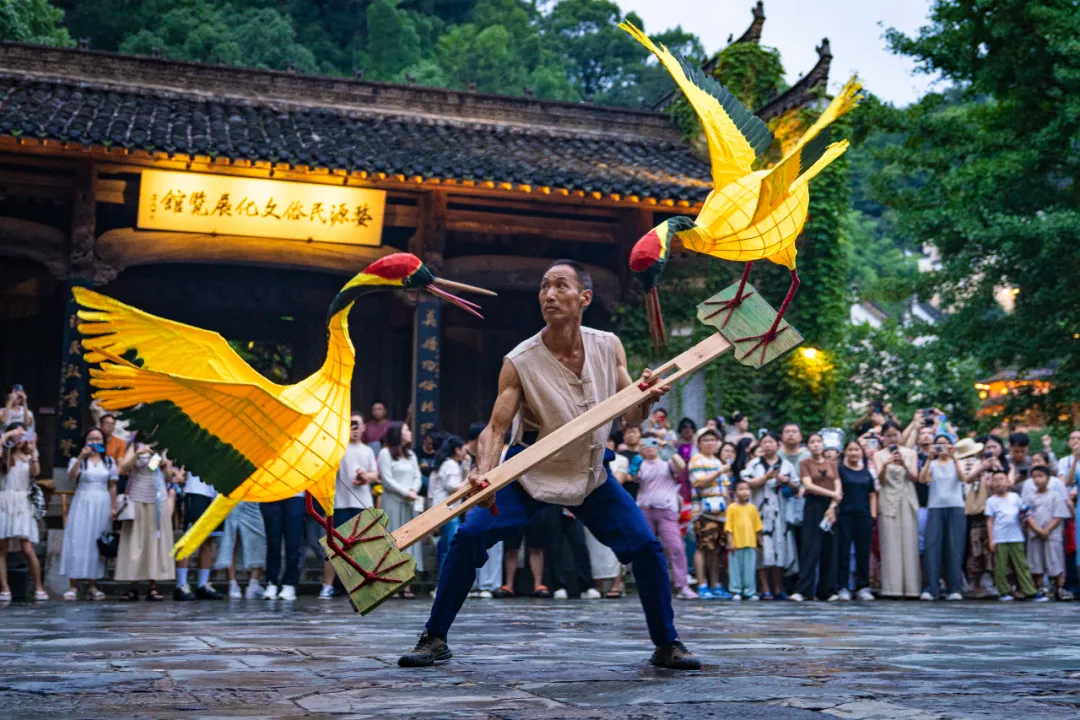 傍晚別錯過非遺舞仙鶴表演,老師傅動作靈活,帶動手中的仙鶴時而引頸長鳴,時而展翅高飛,將仙鶴的神韻帶到人間。鶴鳴陣陣,整個表演如夢如幻,觀眾不由得沉浸其中。