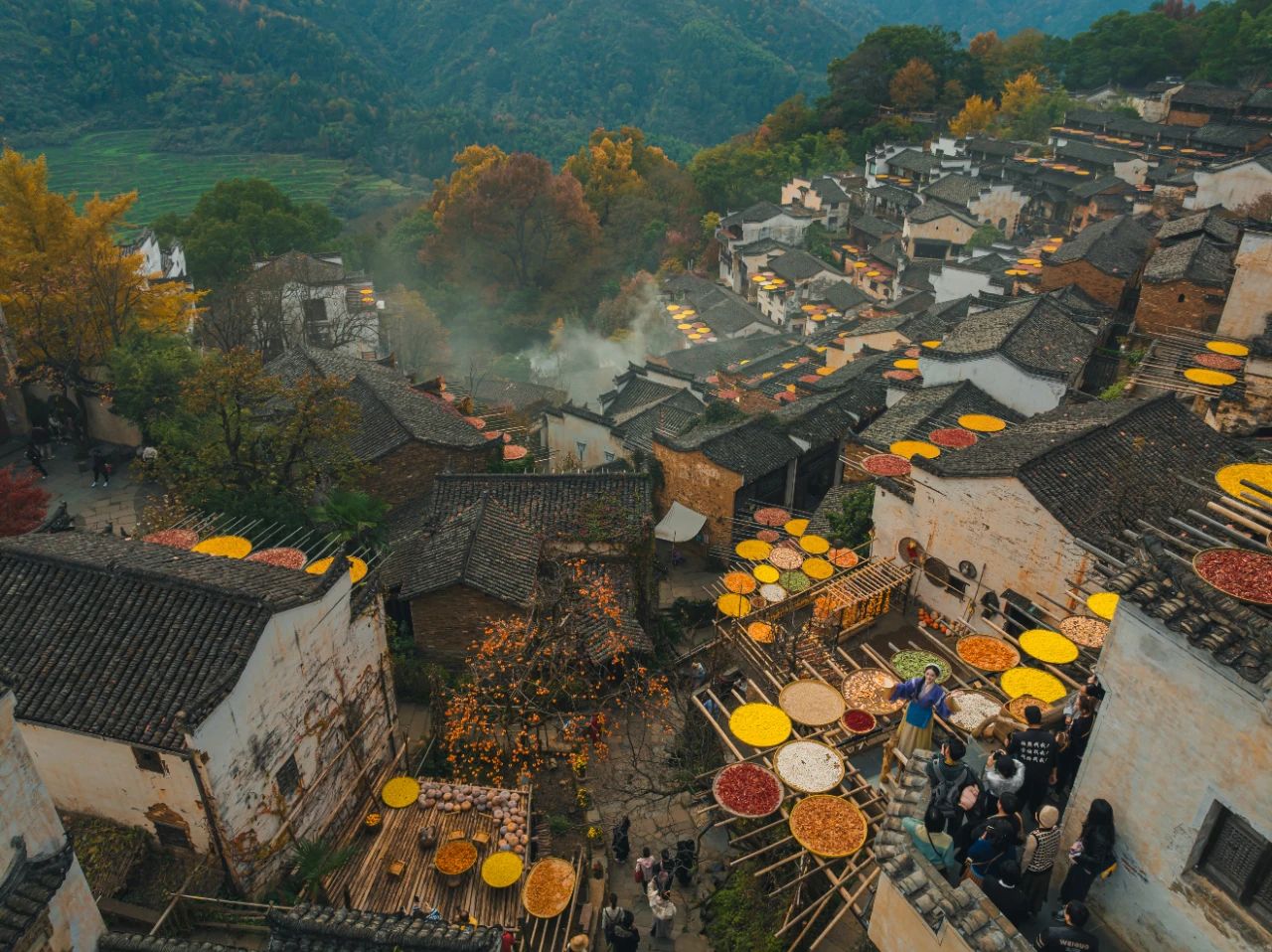 這里的豐收格外觸動人心。柿子樹上的果實紅得鮮艷,繽紛的曬盤點綴著錯落有致的古村,裊裊炊煙勾起淡淡的鄉愁,讓人看到就不禁感嘆:這才是秋天該有的樣子。
