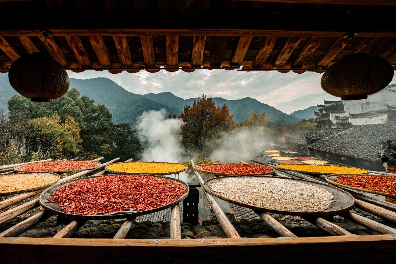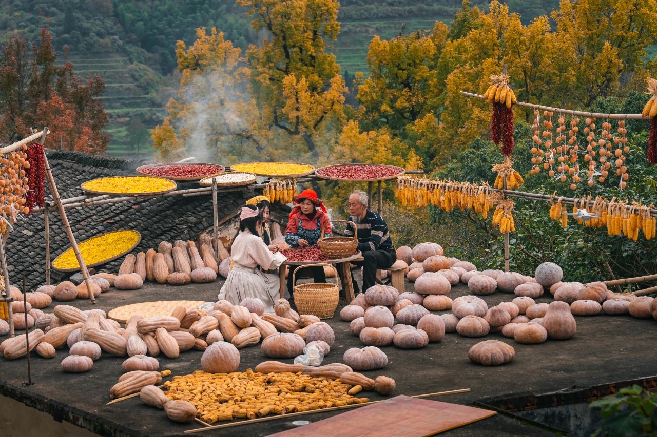 曬秋,是勤勞的篁嶺人與陽光的約定,而現在正是曬秋最豐富的時候。曬秋大媽們將玉米、辣椒、南瓜、皇菊等農作物整齊地擺放在曬架上,遠山縹緲,炊煙裊裊,曬匾與秋葉相映成趣,構成一幅迷人的秋日畫卷。
