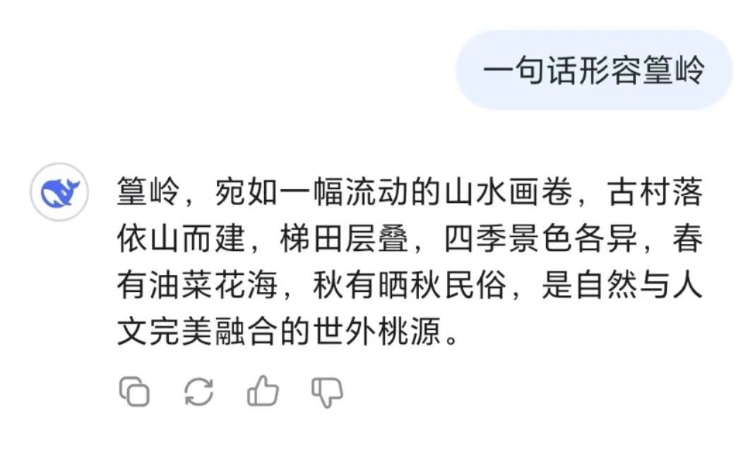 沒錯,篁嶺四季景色各異,宛如一幅流動的山水畫卷,除春秋盛景外,夏季的鄉村奇妙夜以及冬季的民俗體驗都讓人眼前一亮。如今,元宵節將近,讓我們一起來看看deepseek會為我們提供怎樣的出游建議吧~