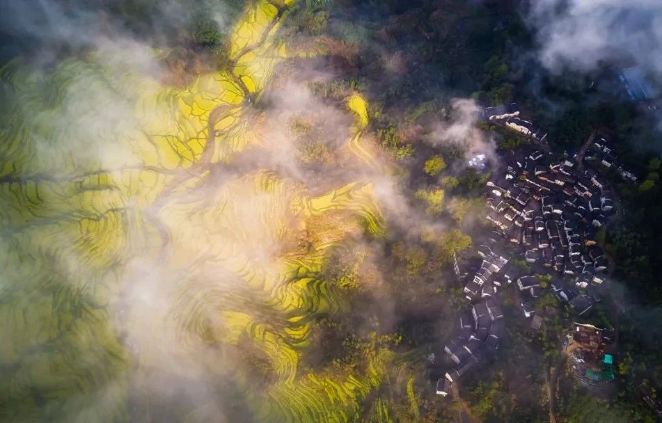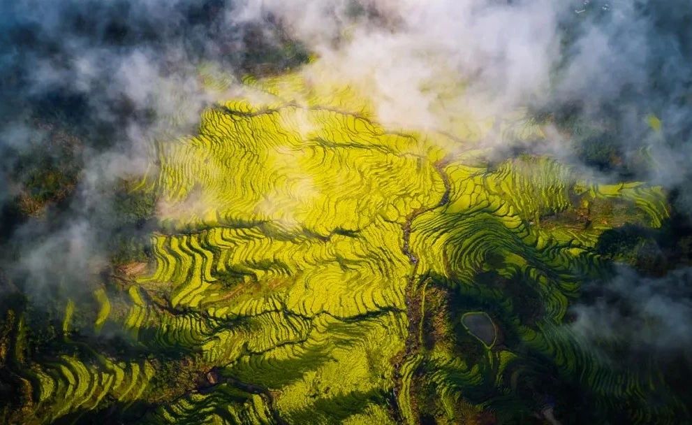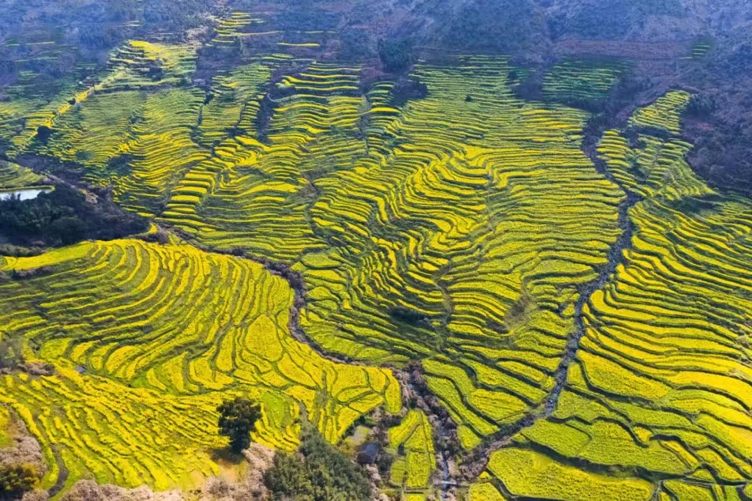 等到盛花期,那抹金色便攀上了梯田,金色的萬畝梯田隨山就勢,重疊有序,從高處俯瞰,猶如“上帝的指紋”,又如一幅金黃色的“太極圖”,蔚為壯觀。