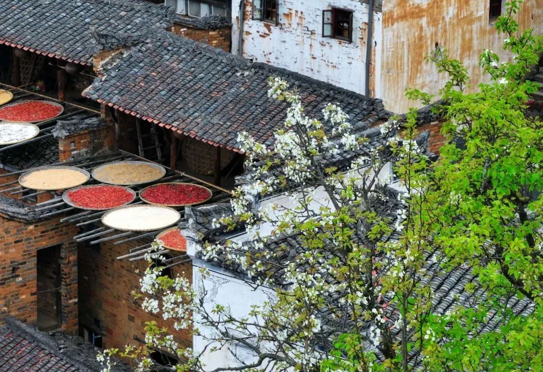 篁嶺曬秋被稱為“最美中國符號”,曬臺上,各色山菜整齊的擺放在曬匾里,映襯著徽派建筑特有的飛檐翹角和層次分明的各色春花,更是別有一番韻味。