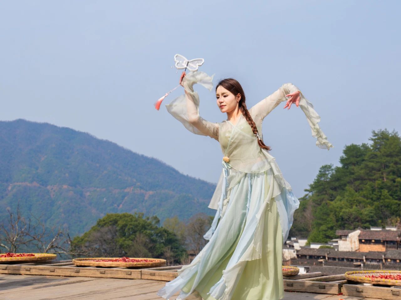 春天腳步輕盈,古村各色春花競相綻放,譜寫出一首歡樂的春日序曲,五桂堂觀景臺(tái)上,數(shù)位篁嶺姑娘們?nèi)箶[飄揚(yáng),踏著音樂翩翩起舞,引得周圍的游客紛紛駐足觀看。