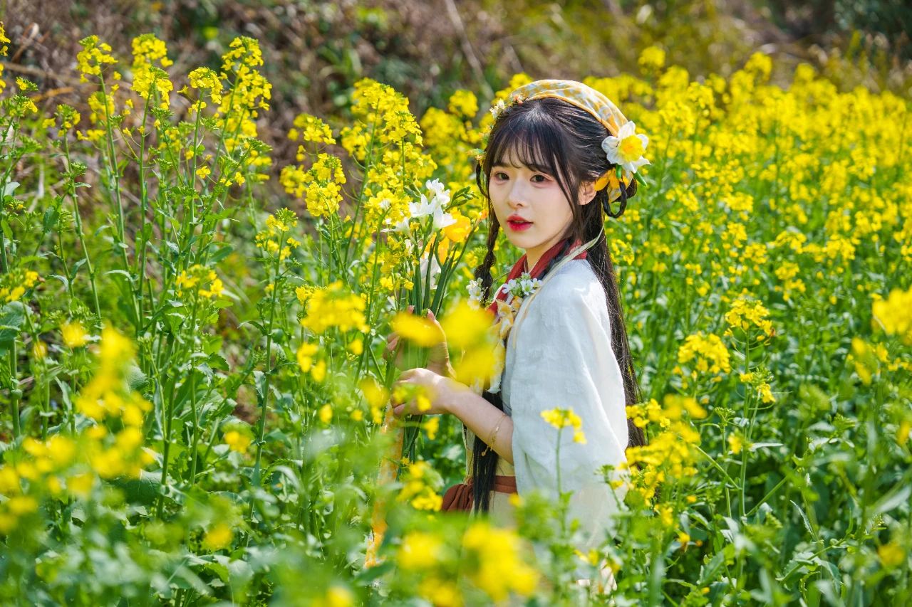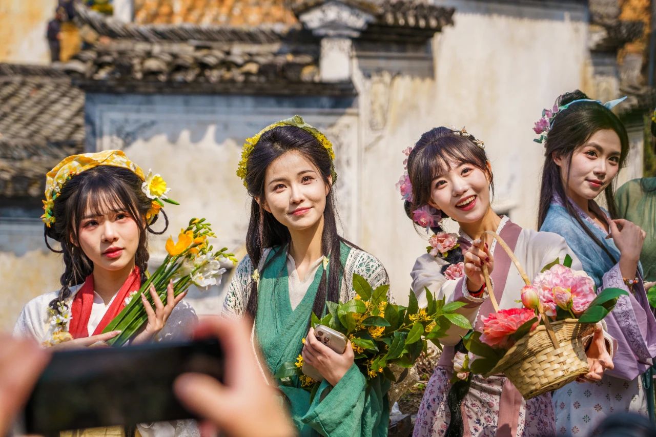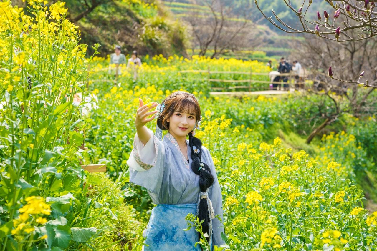 隨后,花神們帶領(lǐng)游客朋友一同從村落巡游至梯田,沿途欣賞著村內(nèi)的古徽建筑和各色春花。行至花海旁,花神們紛紛停住腳步,將最美的自己定格在春天里。