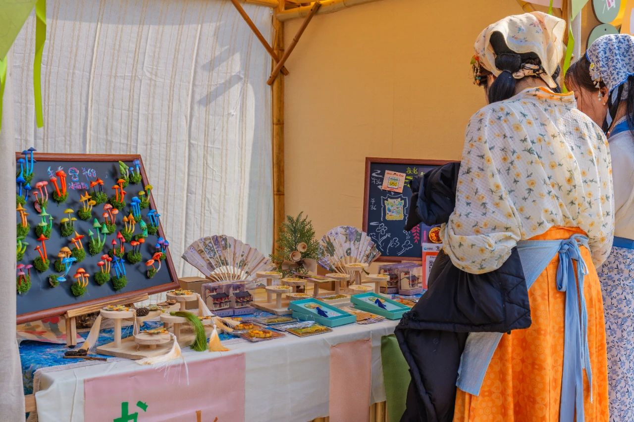 除了豐富的演出節(jié)目,1號(hào)觀景臺(tái)上的「春田花花同學(xué)主題集市」更是熱鬧非凡。古色古香的小攤子上擺滿了琳瑯滿目的商品:特色手工藝品、風(fēng)味美食、古樸的木雕、可愛的陶瓷玩偶……游客們在集市中穿梭,一邊品嘗著美食,一邊挑選著心儀的紀(jì)念品,感受著花朝節(jié)濃郁的文化氛圍。