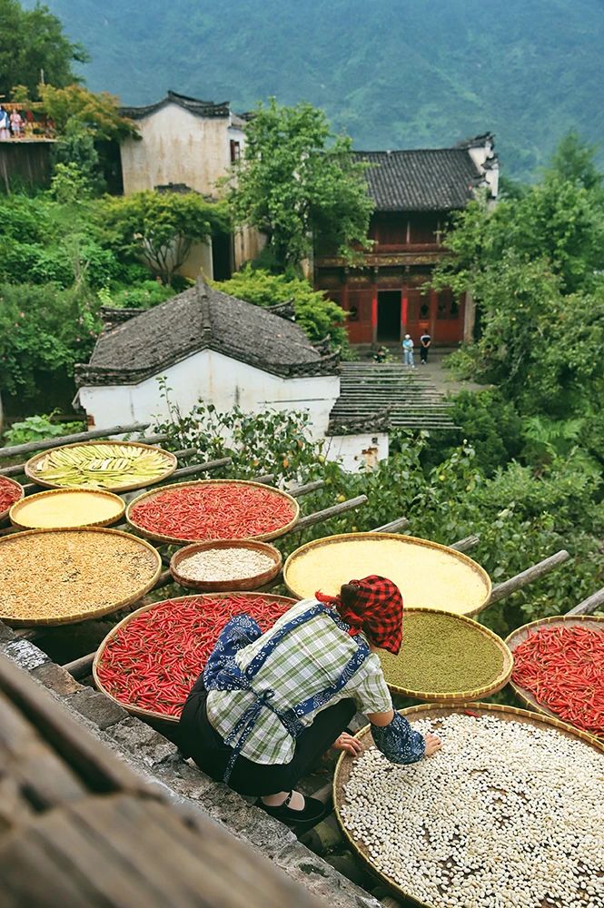 在篁嶺,時間仿佛被拉長。曬匾晾曬在老屋窗前的竹竿上,紅黃交錯。石板路彎彎曲曲,村民挑著擔(dān)子走過。老人在門前剝豆子,孩子在巷子里追逐打鬧,炊煙從黑瓦房頂升起,飄著柴火飯的香味。這里的一切都很慢,你可以和剃頭匠聊聊家長里短,或是坐在百年老宅的庭院里,看云卷云舒。