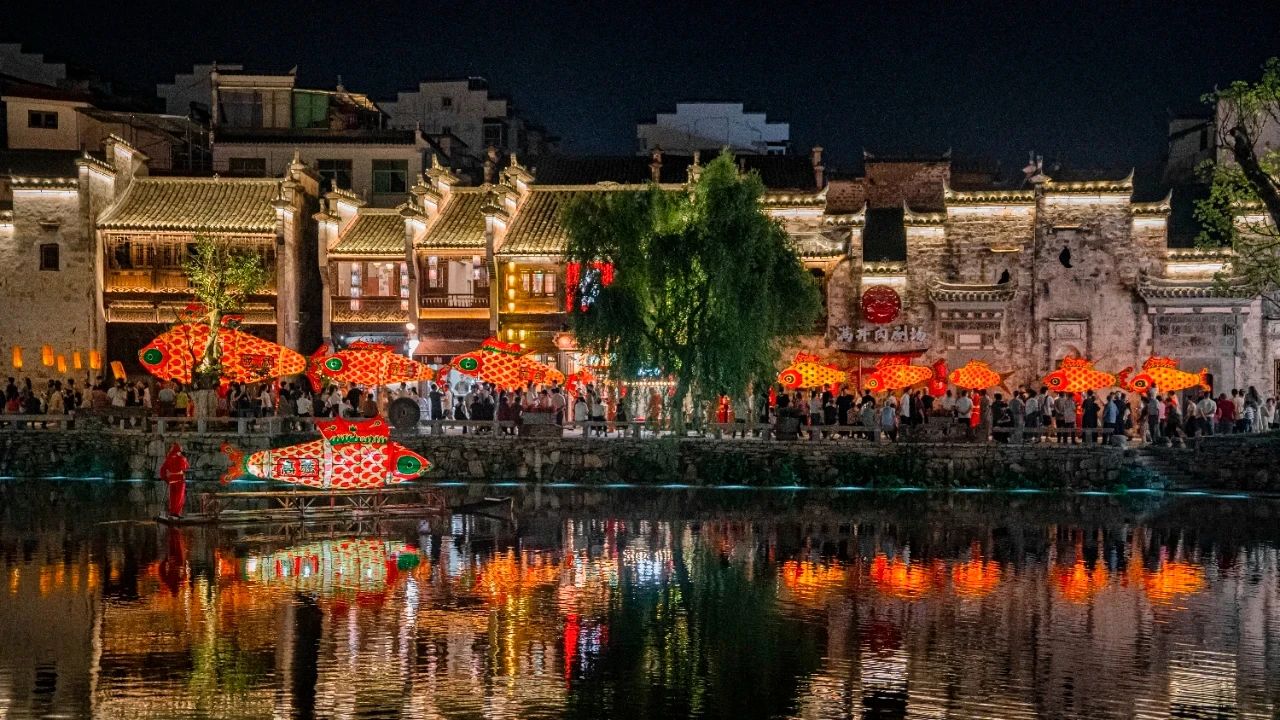 夜晚的高潮當(dāng)屬“星河漫巷”:魚燈隊(duì)伍如游鯉擺尾,檐角燈籠、湖面發(fā)光竹筏交織,點(diǎn)亮青石板路的千年夢(mèng)境。古今交融,煙火氣十足!