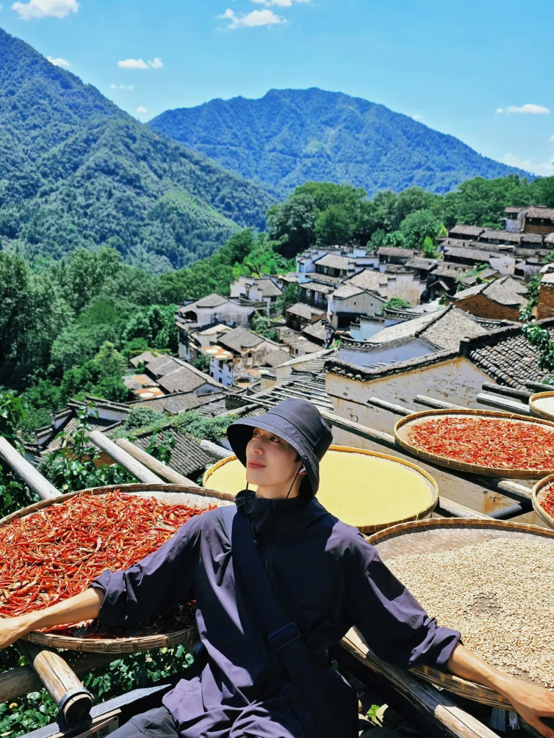 篁嶺古村的“曬秋”永不落幕!火紅的辣椒、金黃的皇菊……在圓圓的曬匾里、在古老的墻頭屋角,潑灑出最濃烈的鄉土藝術。曬工坊是欣賞和拍攝的黃金C位!在這里曬工坊還貼心安排了工作人員,為像小童一樣的獨行游客定格精彩瞬間!
