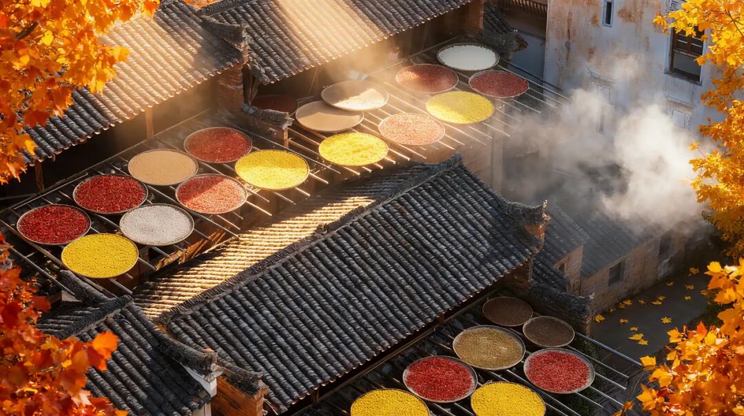 “四時(shí)俱可喜,最好新秋時(shí)”,篁嶺的秋天從不會讓人失望。一進(jìn)古村,最先撞進(jìn)眼里的就是曬秋——曬匾把崖上古村鋪成了調(diào)色盤,辣椒的紅,皇菊的黃,一層層搭在屋頂、掛在曬架上,風(fēng)一吹,連空氣里都裹著糧食的甜香