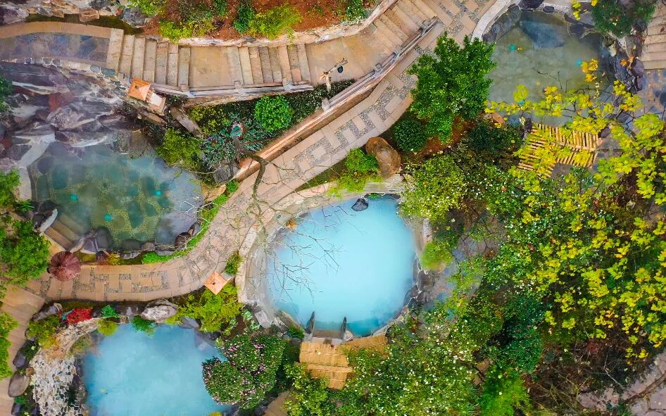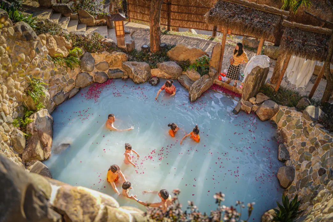 這里的八個(gè)戶外湯池各有講究,愛美的選紅酒湯、牛奶湯,泡完皮膚都透著潤;想舒舒服服松口氣,就試試艾草湯、硫磺湯,暖意順著毛孔往骨子里鉆。
