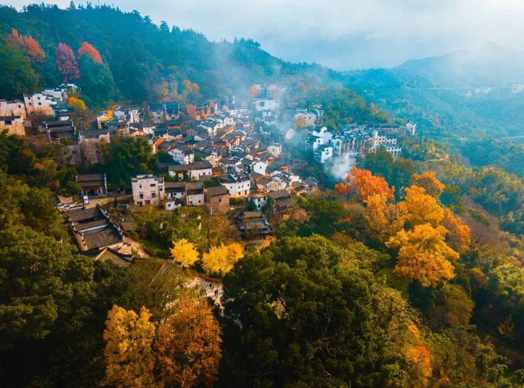 秋日的婺源篁嶺,是一幅流動在山崖間的絕美風景畫。粉墻黛瓦的古徽村落坐落在連綿的石耳山脈間,火紅的楓葉和金黃的銀杏妝點著古色古香的徽派建筑,整個篁嶺好似一片繽紛的秋色海洋。